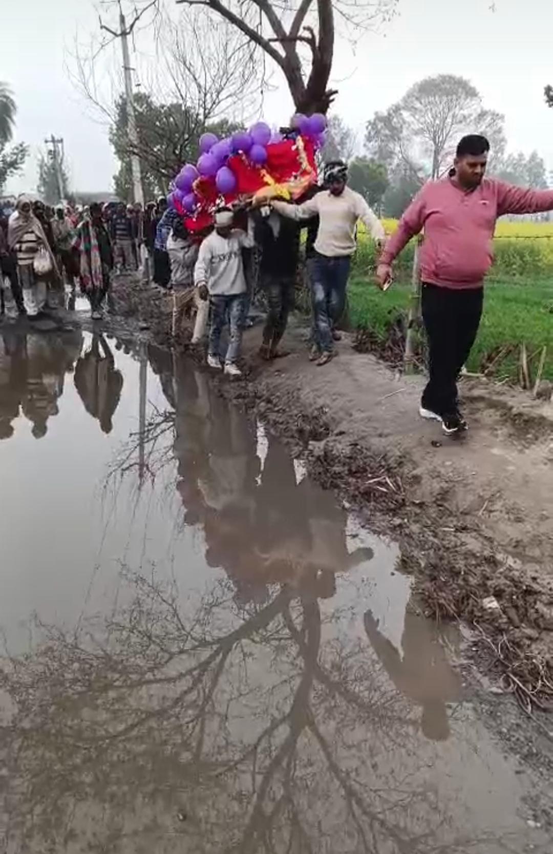 जर्जर सड़क व जलभराव के चलते पगडंडी पर टेड़ी करके निकाली अर्थी, ग्रामीणों में रोष, वीडियो वायरल