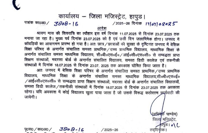 डीएम अभिषेक पाण्डेय के आदेश पर कांवड़ यात्रा एवं शिवरात्रि को ध्यान में रखते हुए 18 से 23 जुलाई तक सभी स्कूल कालेज बंद रहेंगे।