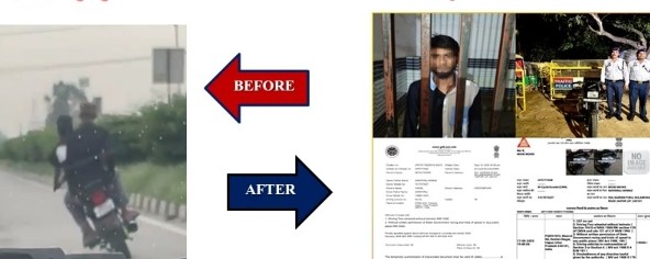 जनपद हापुड़ में एक बाईक पर सवार 2 युवकों द्वारा हाईवे पर चलती कार के आगे स्टंटबाजी करते हुए लापरवाही से बाइक चलाने का वीडियो सोशल मीडिया पर वायरल हुआ, उक्त वायरल वीडियो का हापुड़ पुलिस द्वारा तत्काल संज्ञान लेते हुए बाइक चालक हापुड़ के करीमपुरा निवासी फैसल को मय बाइक सहित हिरासत में लेकर निरोधात्मक कार्यवाही की गयी एवं उक्त बाइक का कुल 19,000/-रुपये का चालान व उक्त बाइक को सीज किया गया है।