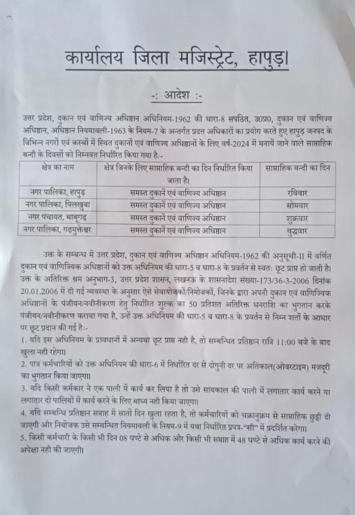 हापुड़। उत्तर प्रदेश, दुकान एवं वाणिज्य अधिष्ठान अधिनियम-1962 की धारा-8 सपठित, उ०प्र०, दुकान एवं वाणिज्य अधिष्वान, अधिष्ठान नियमावली-1963 के नियम-7 के अन्तर्गत प्रदत्त अधिकारों का प्रयोग करते हुए हापुड़ जनपद के विभिन्न नगरों एवं कस्बों में स्थित दुकानों एवं वाणिज्य अधिष्ठानों के लिए वर्ष-2024 में मनायें जाने वाले साप्ताहिक बन्दी के दिवसों को निम्नवत निर्धारित किया गया है:-