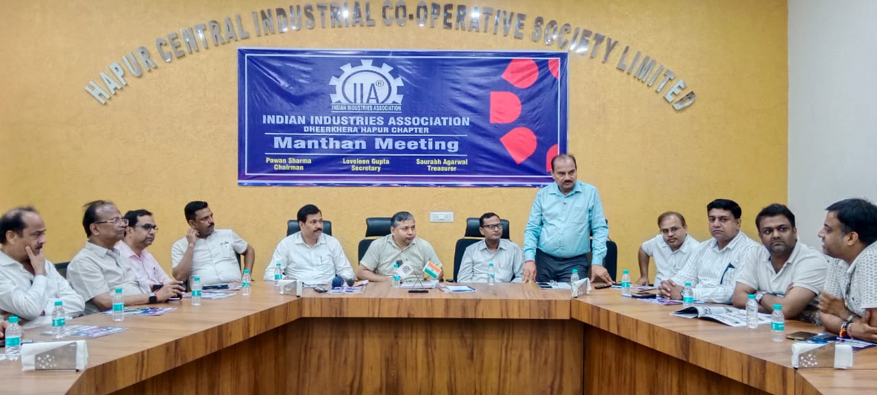 हापुड़ । आईआईए धीरखेड़ा हापुड़ चैप्टर के चेयरमैन पवन शर्मा की अध्यक्षता मे सोसाइटी भवन धीरखेड़ा पर एक मंथन बैठक का आयोजन किया गया। बैठक मे चर्चा का मुख्य विषय वित्त मंत्री निर्मला सीतारमण के द्वारा 22 सितंबर 2025 से जी०एस०टी की दरों मे किए गए बदलाव के ऊपर था। जी०एस०टी की दरों मे बदलाव के बाद उद्योगों पर पड़ने वाले प्रभाव तथा इससे संबंधित नई जानकारी पर विस्तारपूर्वक चर्चा करने जी०एस०टी हापुड़ के उपायुक्त लालचंद अपनी टीम के साथ बैठक मे उपस्थित रहे।
