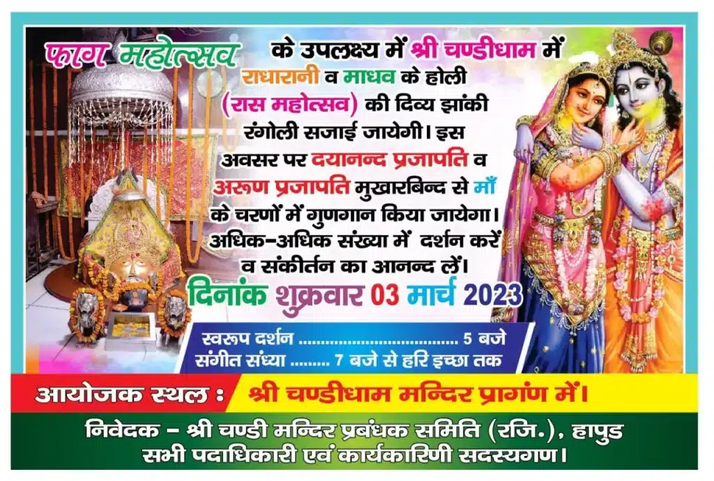 आप सभी को आमंत्रित करते हुए हर्ष हो रहा है कि फाग महोत्सव के उपलक्ष्य में श्री चंडी धाम में राधा रानी व माधव के होली ( रास महोत्सव) की दिव्य मनोरम झांकी रंगोली सजाई जा रही है।