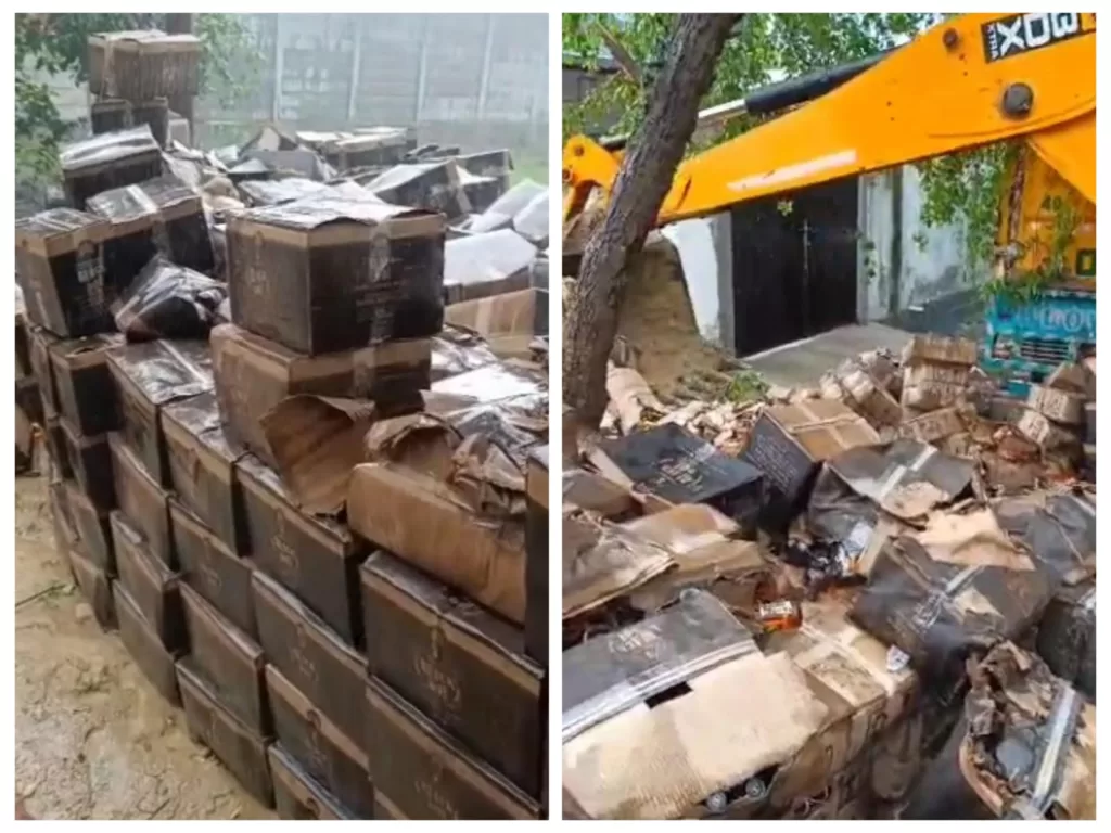 थाना पिलखुवा क्षेत्र में विभिन्न मामलों में पकड़ी गई 80 लाख की 1100 पेटी अंग्रेजी शराब को कोर्ट के आदेश पर बुल्डोजर चलवाकर नष्ट कर दिया।