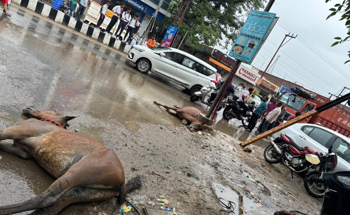 जलभराव में एक लोहे का बिजली खंभा लंबे समय से एक पेड़ के सहारे झुका हुआ था। उसमें कंरट आ गया। जिस कारण करंट उतरने से दो घोड़ों की दर्दनाक मौत हो गई।