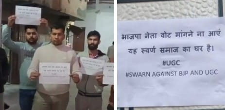 थाना सिम्भावली क्षेत्र में यूजीसी के नए भेदभाव-निरोधक कानून का विरोध में लोगों ने अपने घरों के बाहर कानून का विरोध करते हुए “स्वर्ण अगेंस्ट बीजेपी” के पोस्टर चस्पा किए हैं। जिसका वीडियो सोशल मीडिया पर वायरल हो रहा है।