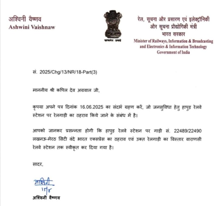 रेलमंत्री अश्विनी वैष्णव ने जिला प्रभारी मंत्री कपिल देव अग्रवाल को भेजें पत्र में जानकारी देते हुए बताया कि रेल मंत्रालय ने हापुड़ रेलवे स्टेशन पर वंदे भारत एक्सप्रेस के ठहराव व वाराणसी तक जायेगी।