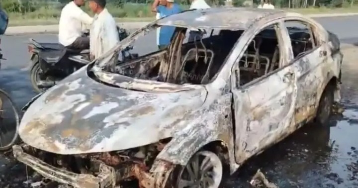 शॉर्ट सर्किट से कार में लगी भीषण आग, बाल बाल बचे कार सवार