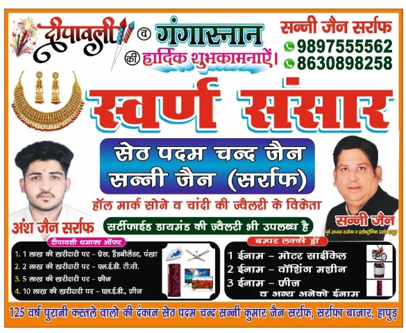 स्वर्ण संसार व सेठ पदम चन्द जैन सन्नी जैन (सर्राफ) की तरफ से दीपावली, गंगास्नान की हार्दिक शुभकामनाऐं।