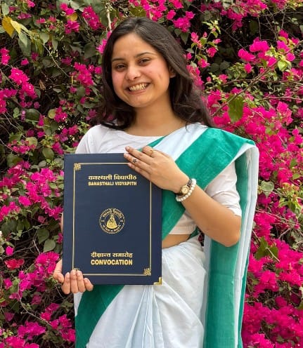 वनस्थली विद्यापीठ में इलेक्ट्रॉनिक्स और इंस्ट्रुमेंटेशन इंजीनियरिंग में बी.टेक की छात्रा है। जिन्होंने बीटेक में यूनिवर्सिटी टॉप किया।