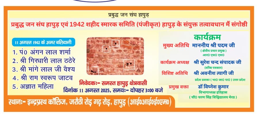 प्रबुद्ध जन संघ व 1942 शहीद स्मारक समिति के तत्वावधान में शहीदों की याद में 11 अगस्त को हापुड़ में एक संगोष्ठी आयोजित की जायेगी।